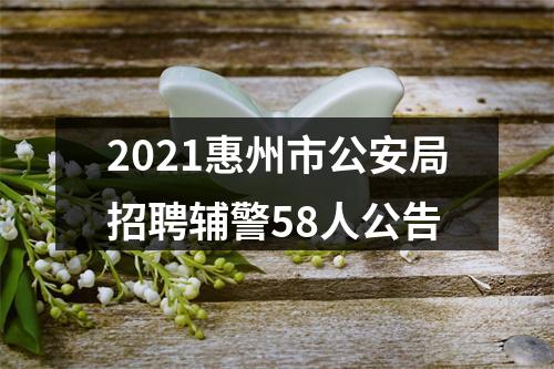 因我局工作需要,根据《广东省公安机关警务辅助人员管理办法》《惠州市公安机关警务辅助人员管理办法(修订)》等文件规定,按照公开、平等、竞争、择优的原则,面向社会公开招聘警务辅助人员58名。现将有关事项公告如下: