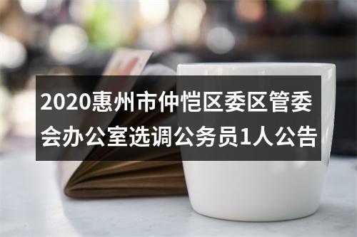 惠州公务员:2020惠州市仲恺区委区管委会办公室选调公务员1人公告已发布。请参加本次公开遴选公务员的考生在规定时间内报名,具体公告详情如下。更多惠州公务员考试备考资料,请点击惠州公务员考试网。