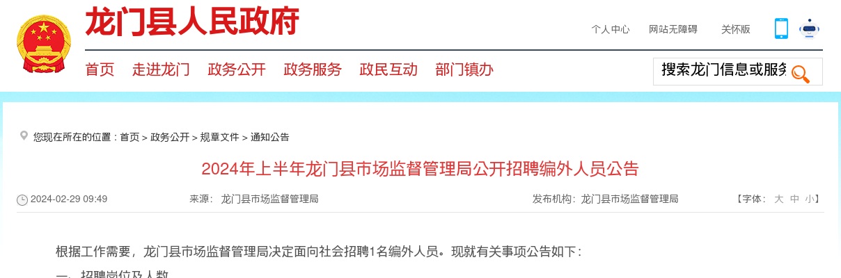 原标题:2024年上半年龙门县市场监督管理局公开招聘编外人员公告