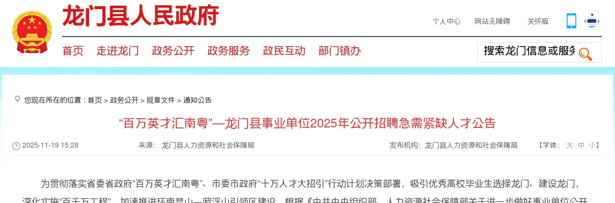 原标题:“百万英才汇南粤”—龙门县事业单位2025年公开招聘急需紧缺人才公告