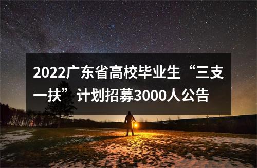 2022年,通过统一组织考试,全省计划选拔招募3000名左右高校毕业生到我省从事“三支一扶”志愿服务,服务期为2年。报名人员可通过广东省人力资源和社会保障厅网站(http://hrss.gd.gov.cn)、广东人事考试网(http://rsks.gd.gov.cn)查阅具体的招募岗位和资格条件等。