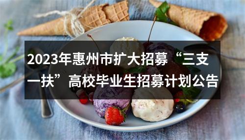 根据《转发<关于进一步引导和鼓励高校毕业生到基层工作的实施意见>重点任务分工方案的通知》(惠市人社函[2019]136号)文件精神,2023年我市继续扩大招募一批惠州户籍(生源)高校毕业生到基层从事支教、支农、支医和帮扶乡村振兴等志愿服务(简称为“三支一扶”)。现将有关事项公告如下: